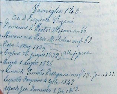 «Alle figure» est une expression qui est souvent notée à côté des individus énumérés dans les recensements des diverses paroisses de la commune de Barga. Au recensement de Loppia de 1853, c'est le cas pour Cristino STEFANI et son frère Pietro. On a indiqué «alle figure» à côté de leur nom. Ils sont partis hors de leur commune pour vendre des figurines de plâtre, possiblement comme vendeurs itinérants, et ce depuis au moins 1847.